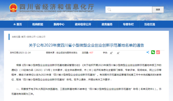 日前,四川省經濟和信息化廳公布了2023年度四川省小型微型企業創業創新示范基地名單,科源運營的同心協同創新園喜獲殊榮,也為科源再添新輝煌!